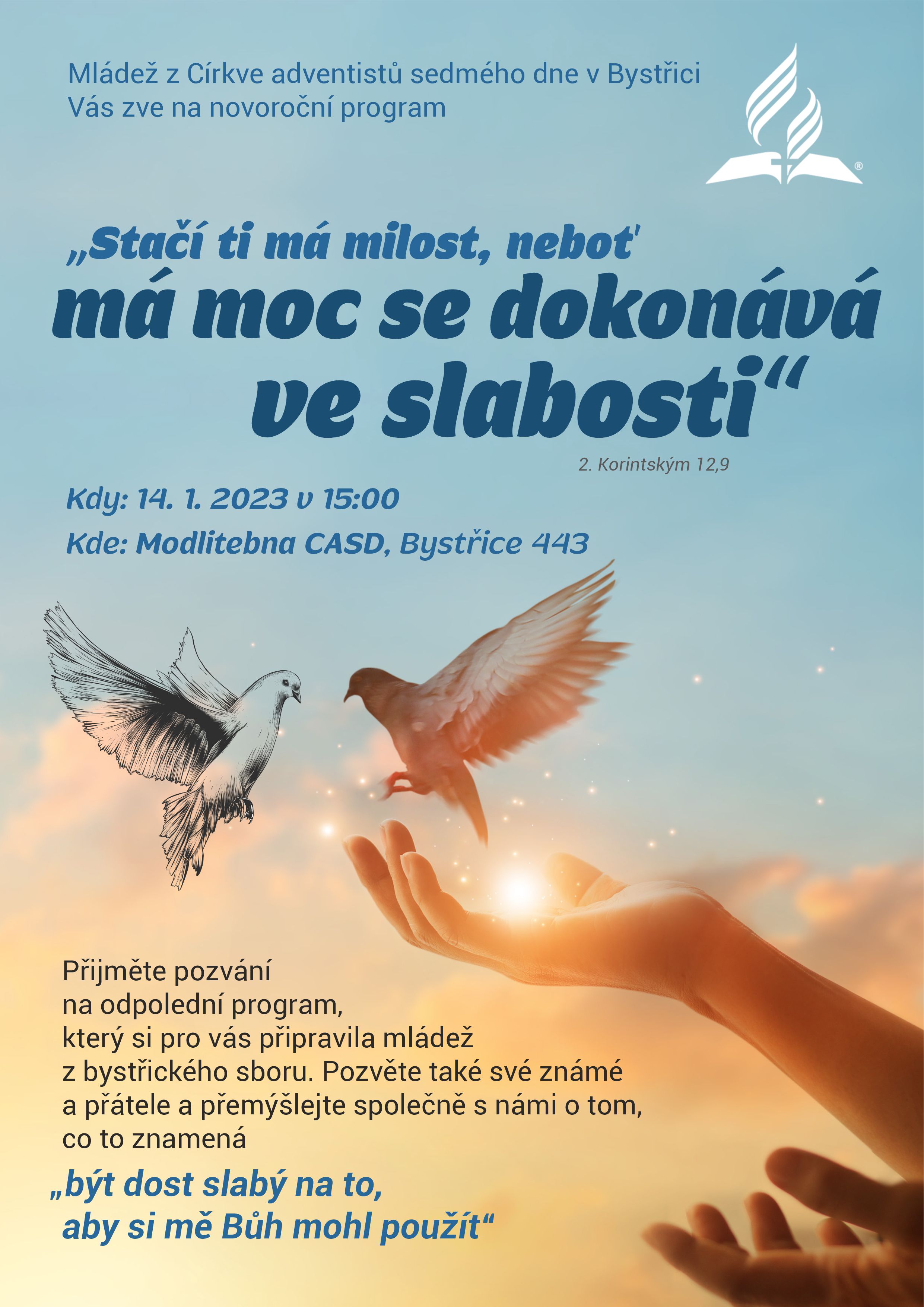 Přijměte pozvání na odpolední setkání, které si pro nás připravila naše mládež. Téma odpoledního programu vychází z biblického verše zapsaného v 2. Korintským 12,9: "Stačí ti má milost, neboť má moc se dokonává ve slabosti." Hlavní myšlenka celého programu bude propojena otázkou: "Co to znamená být dost slabý na to, aby si mě Bůh mohl použít?" Pokud vás odpověď zajímá, tak určitě přijďte a pozvěte také své známé a přátele.