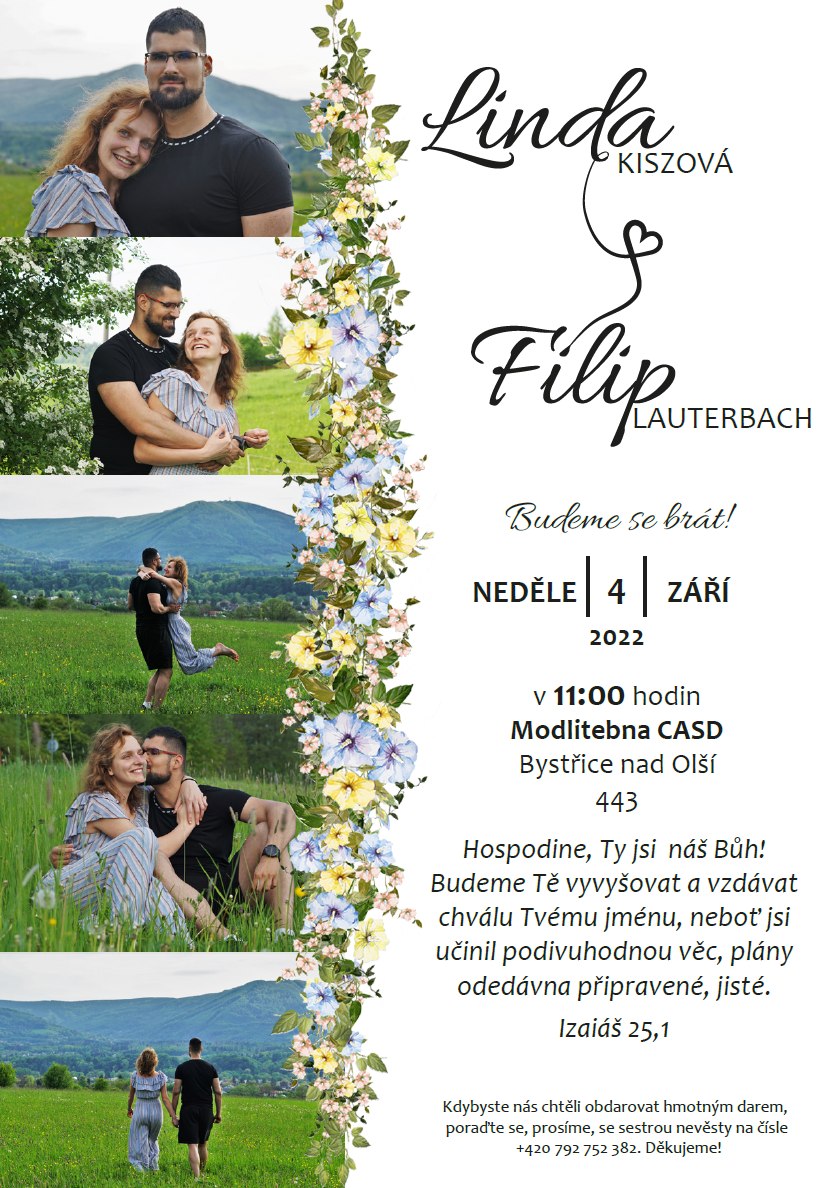Zveme Vás na svatební obřad dvou mladých lidí, který se uskuteční v naší modlitebně od 11:00 hodin. Jste srdečně zváni.
