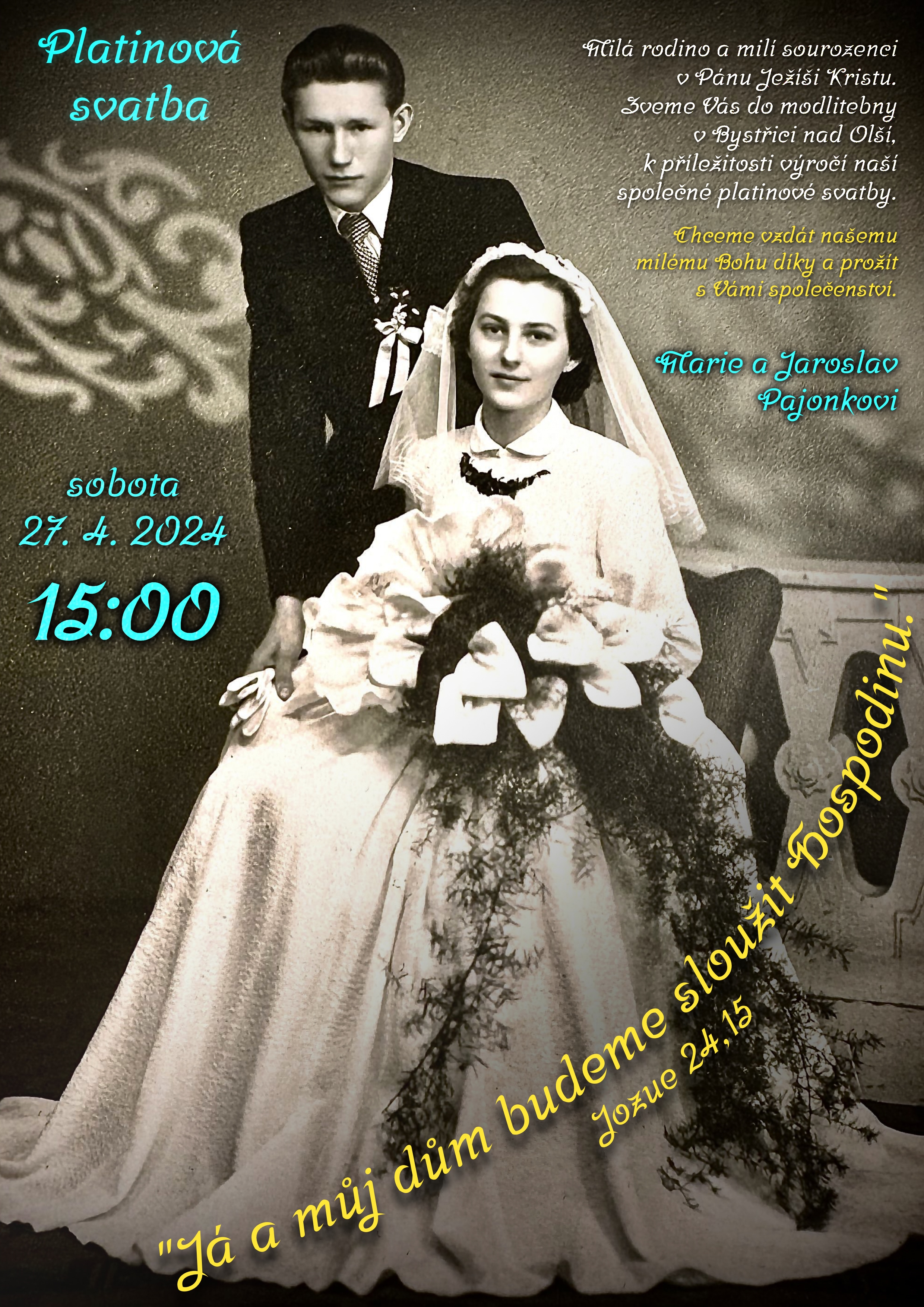 Milá rodino a milí sourozenci v Pánu Ježíši Kristu, zveme Vás v sobotu 27. 4. v 15:00 do modlitebny v Bystřici nad Olší, k příležitosti výročí naší společné platinové svatby. Chceme především vzdát našemu milému Bohu díky a prožít s Vámi společenství. Marie a Jaroslav Pajonkovi.